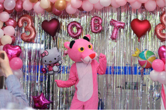 一大清早,男同事乔装打扮的“顽皮豹”就出现在公司大门,变着法向大家问好,迎接女神们的到来。公司别出心裁,为员工编织了一个少女的“粉红梦”。