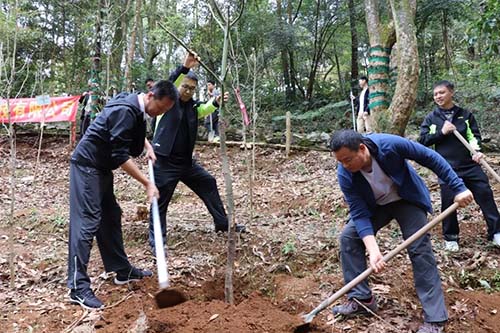 周总、张总、谭总三人合力种植了第一颗树苗,拉开本次植树活动的序幕。