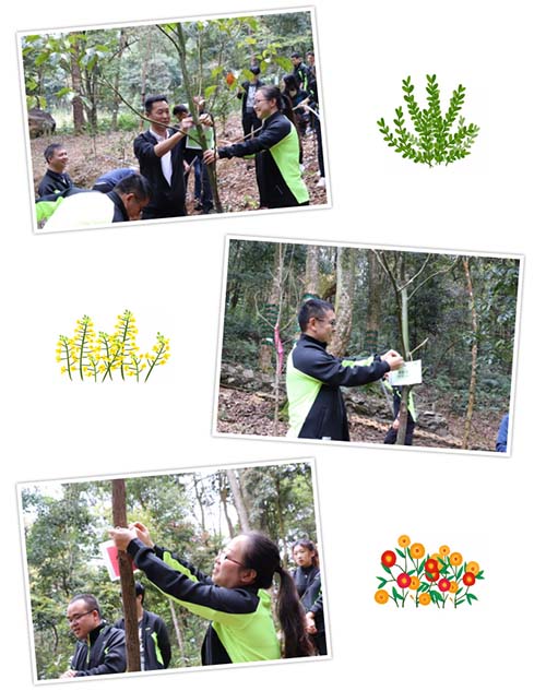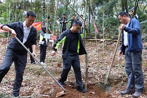短短一上午的时间,原本空旷的山地变得生机勃勃、绿意盎然。领导们将写上寄语的牌子挂在树苗上,祝福小树苗茁壮成长。